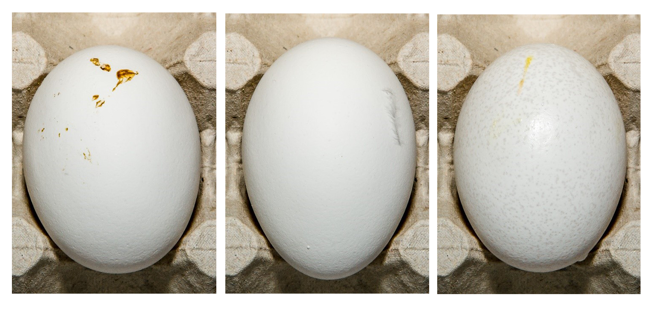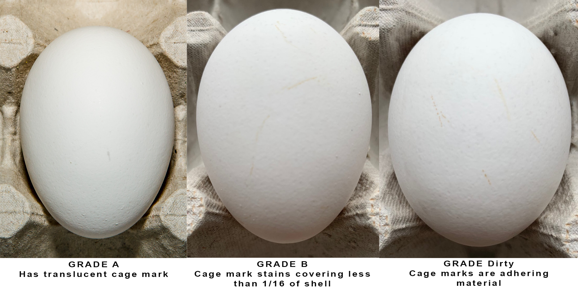 Grade A eggs must be clean (see Figure 1). Grade A eggs may show small specks, stains, or cage marks that do not detract from the general clean appearance of the egg. Grade A eggs can also show traces of processing oil (used to preserve freshness). The processing oil may create a shiny or opaque appearance.