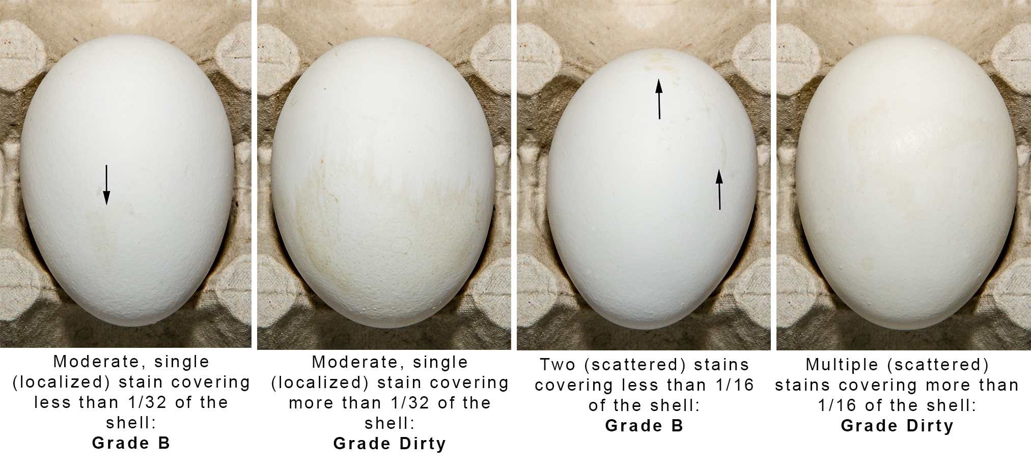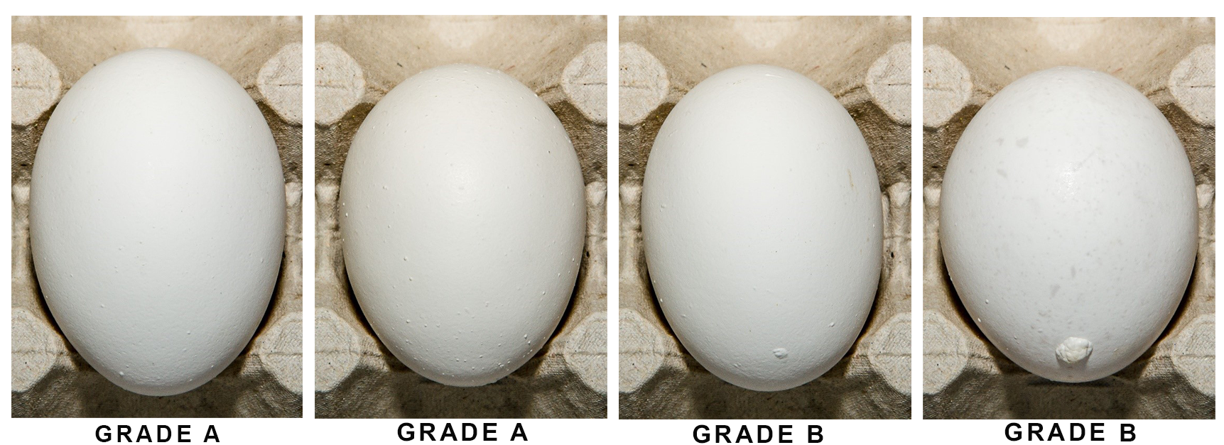 If any of the calcium deposits are larger than 1/8th inch in diameter, the egg is classified as Grade B. A good rule of thumb is that if you were to run your fingernail across a calcium deposit and a good size hole would be created if it came off, then the egg would be classified as Grade B.