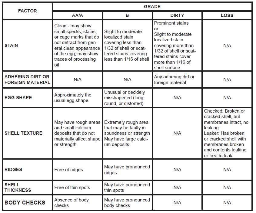 Table 1. USDA Standards for grading market eggs (click on image to enlarge).