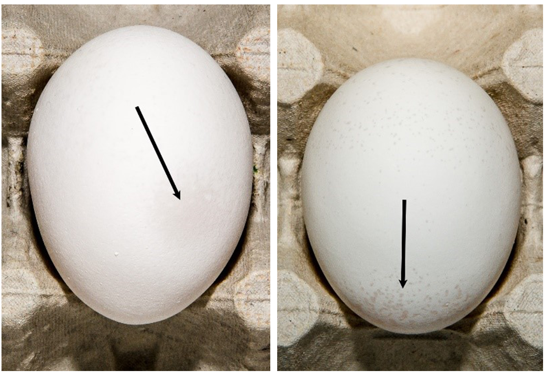Evaluating eggs for exterior quality reduces the number of eggs with defects that detract from the eggs’ appearance or that would have a low probability of surviving the rigors of handling in normal market channels. In other words, we want the consumer to have clean, unbroken eggs with practically normal shape and texture. Contestants should not be too harsh in assigning a grade to eggs that may have minor defects. This is especially important when judges have gained experience in evaluating eggs with various degrees of abnormalities. Shell color does not affect the quality of the egg and is not a factor in the U.S. standards and grades. Eggs are usually sorted for color and sold as either “whites” or “browns.” For the 4-H poultry judging contest exterior egg classes, all chicken eggshell colors can be used. In a contest, excessively speckled brown eggs should not be used.