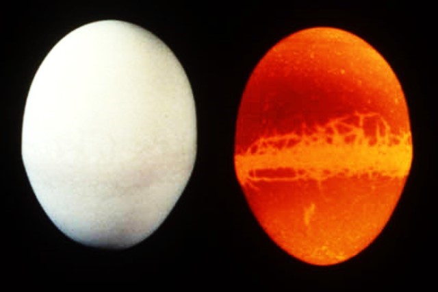 Body checks can cause weakened shells. This is a condition in which the eggshell looks like it is cracked but the shell is intact. Body check occurs during shell formation when the shell is cracked and then partially calcified before being laid. An egg with body check is classified as Grade B. When candled (see Figure 11), the shell can be seen to be intact, but weak. This should not be confused with a 'Check egg' which is graded as a Loss egg.
