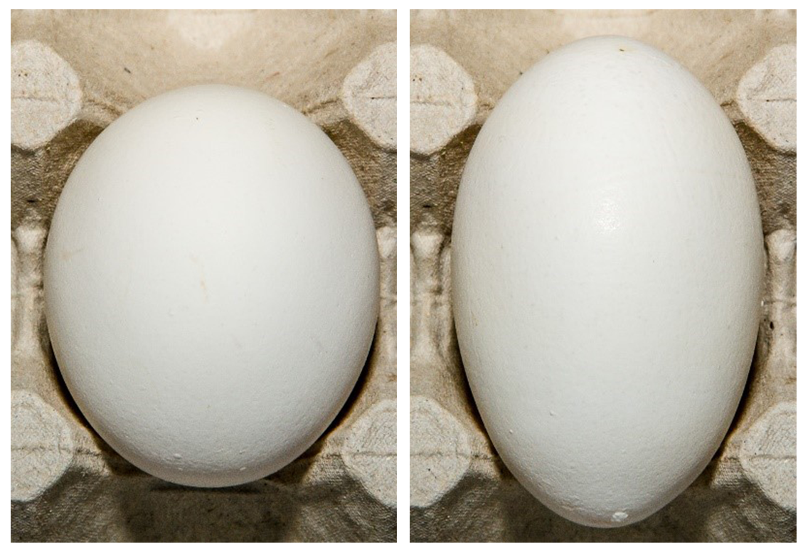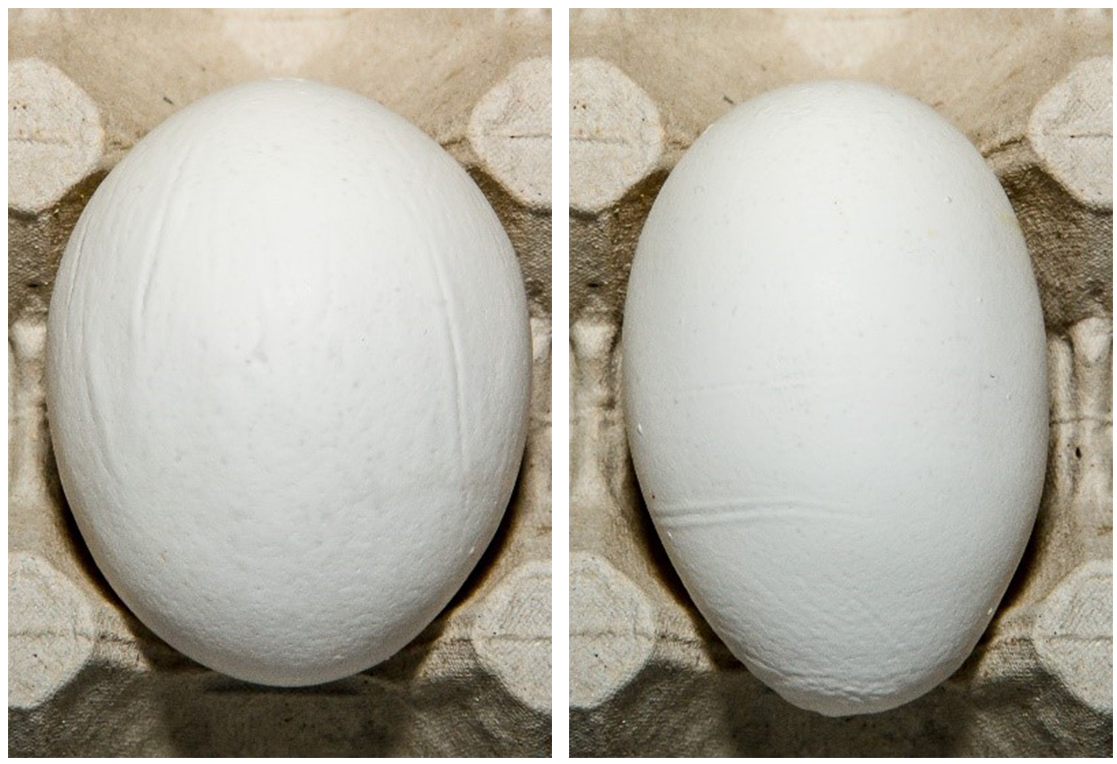 A considerable range of egg shapes may be considered “approximately the usual shape” or Grade A (see Figure 1). Eggs that are spherical (round) or too long to fit in the egg carton should be graded B quality (see Figure 6). B quality grades include eggs that are clearly misshapen or that have definite flat areas.