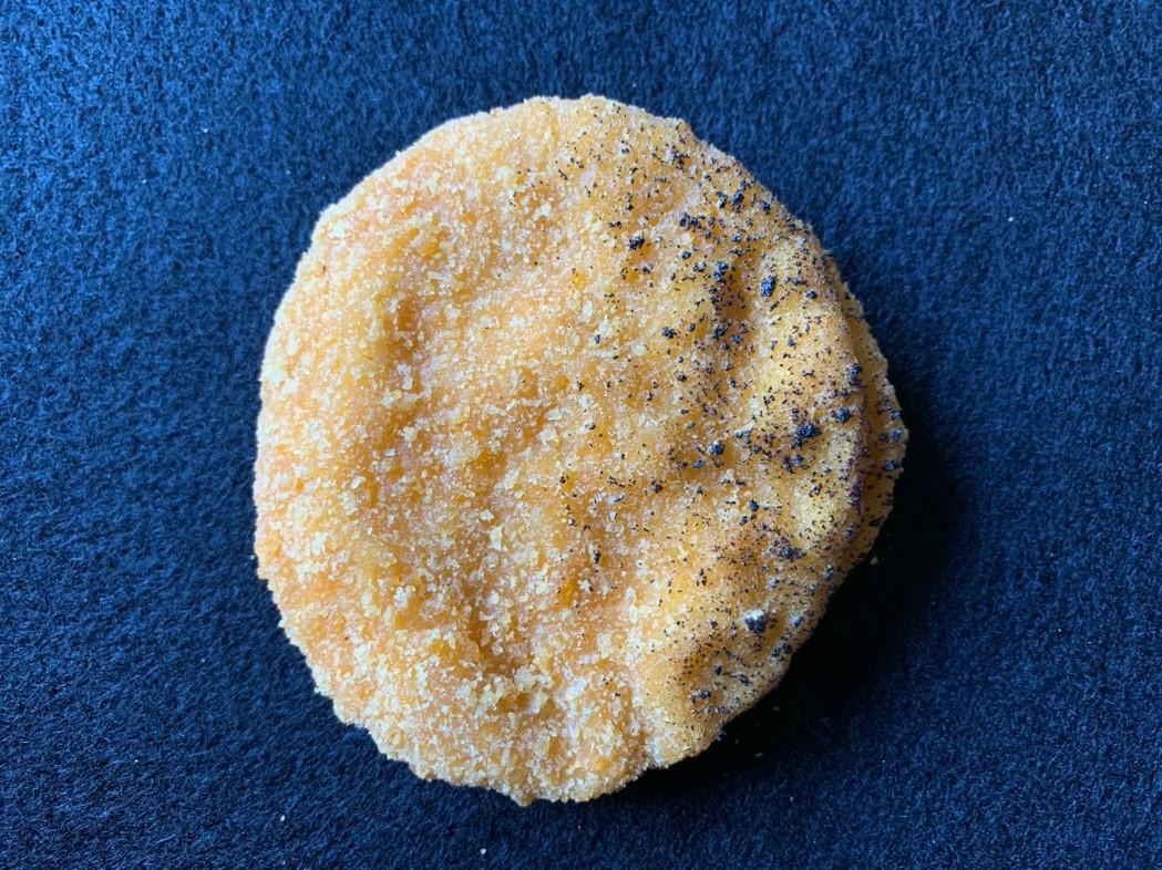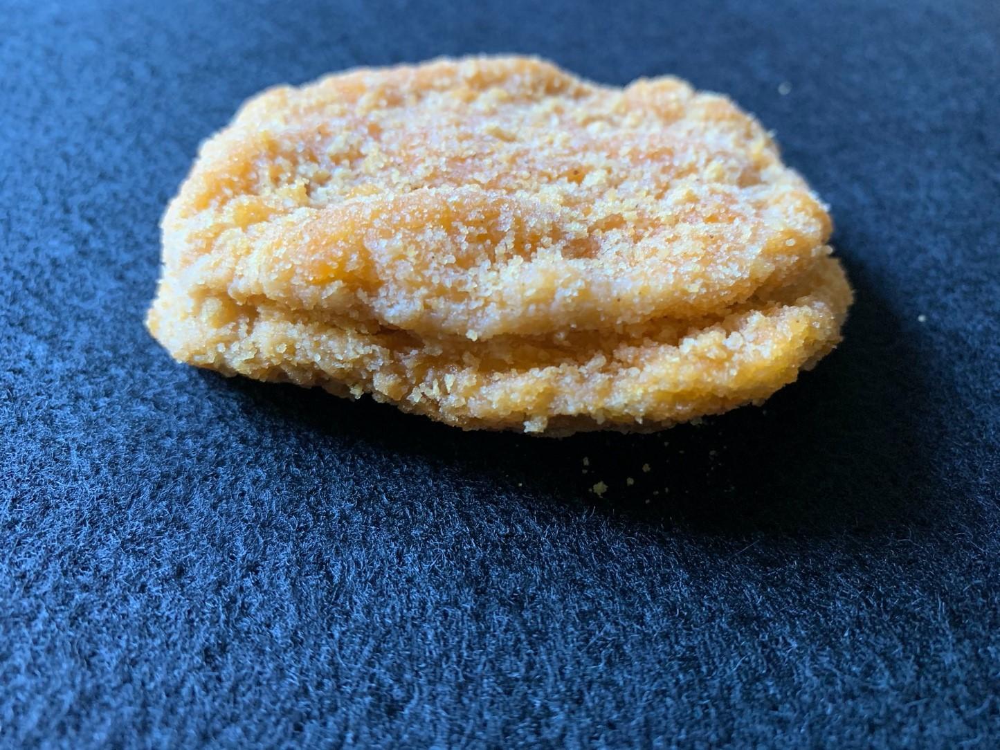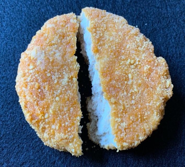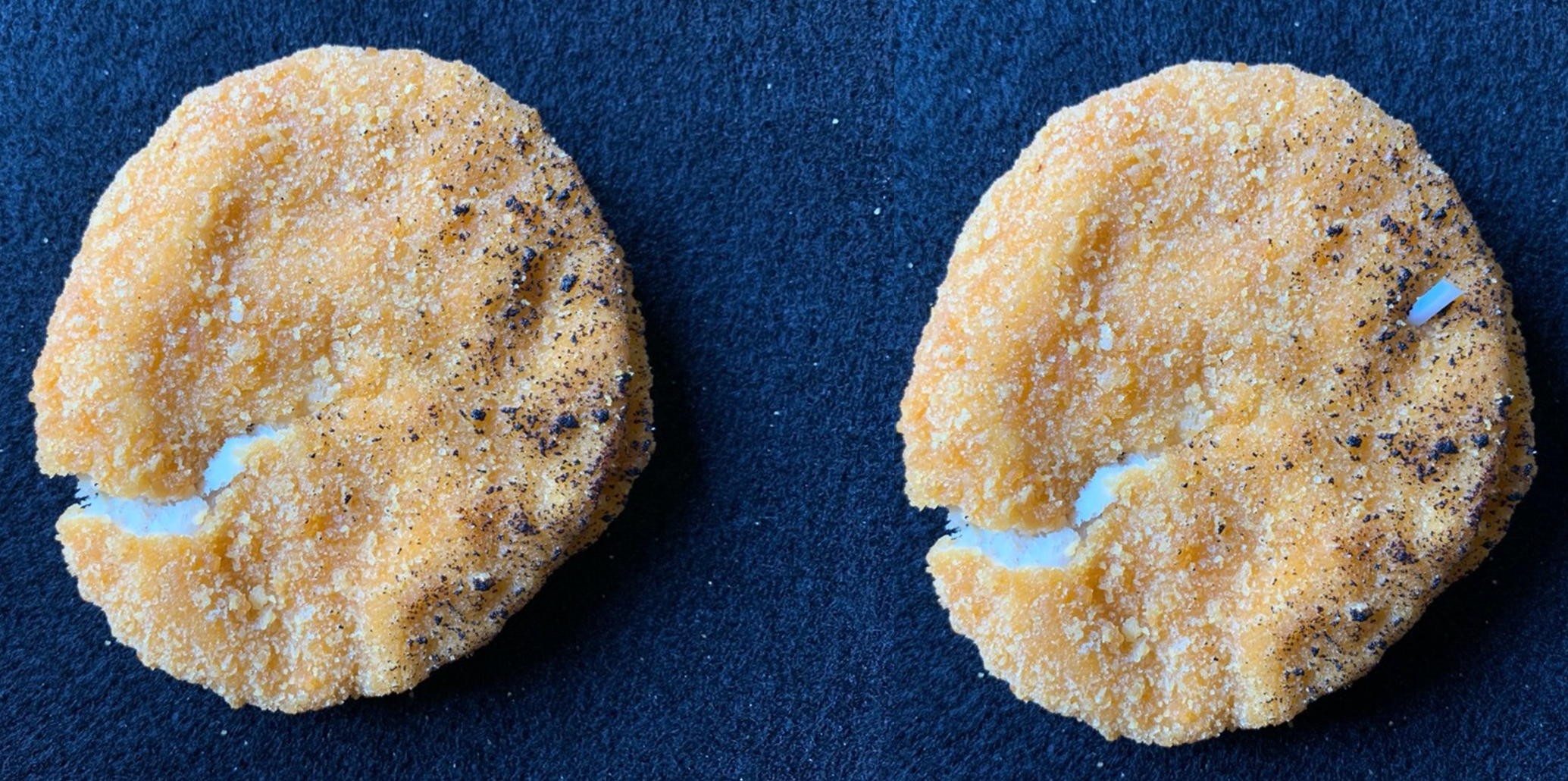 The thickness and evenness of the breading and how well it adheres to the surface of the meat are the most important factors when determining coating coverage. The product surface should be completely covered with a uniform texture and appearance. This defect must be a continuous void that exceeds the allowed limit of breading voids: >¼ inch on tenders and nuggets; and >½ inch on patties. Voids on a single product are not added together. If three pieces are shown, the amount of void is not additive over the three pieces.