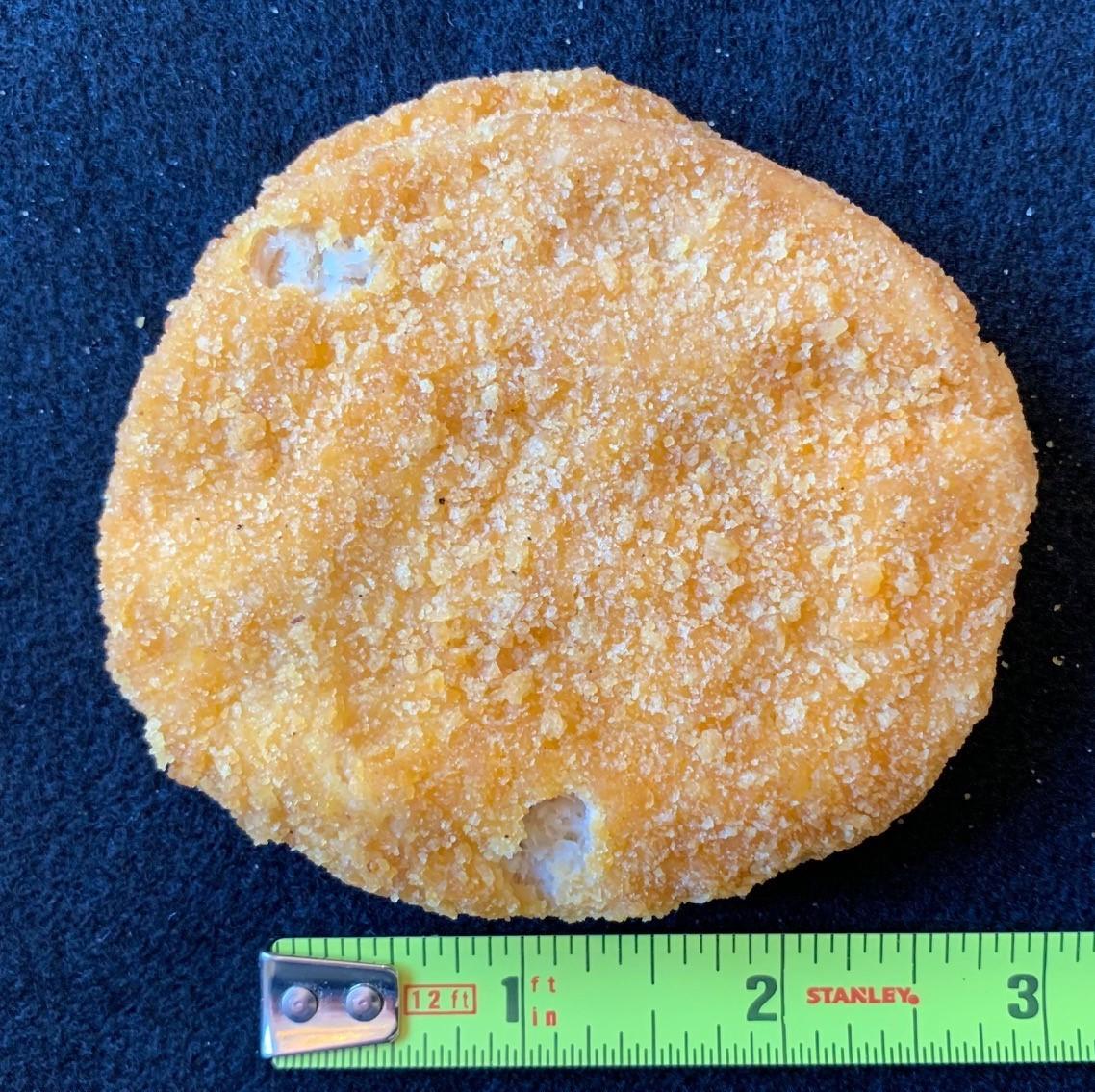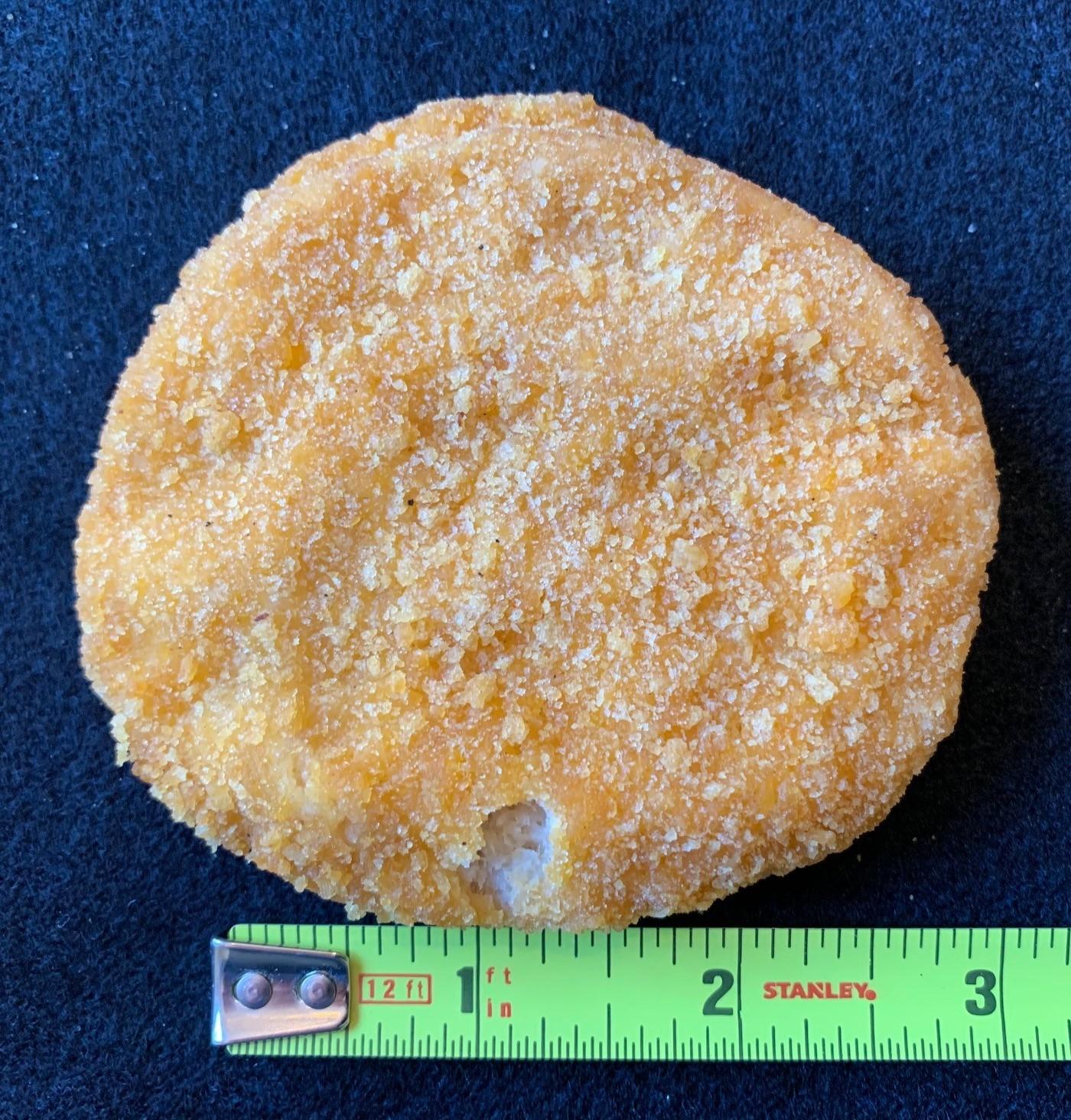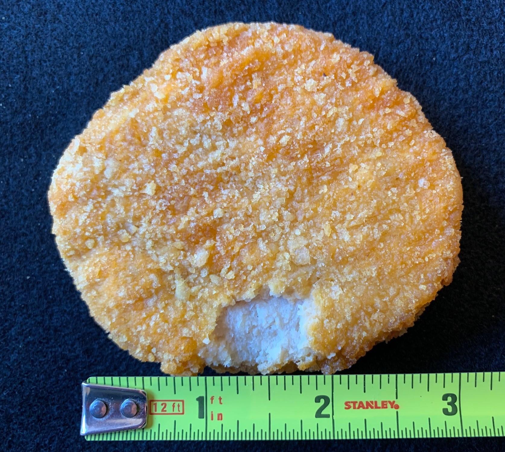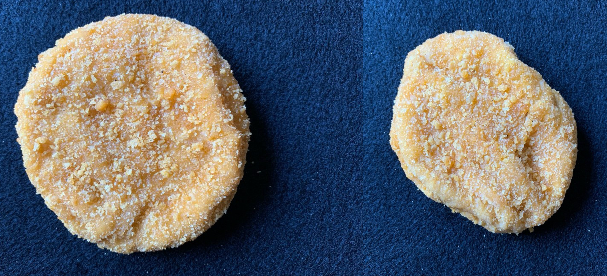 The inconsistent size or shape of the product is based on the uniformity of a product line. There are many shapes and sizes of boneless chicken products. For example, nuggets are processed in a variety of shapes from stars to dinosaurs. Slight variation is expected, however, substantial differences or variations in shape and size of products can affect consumer preferences and cook times. Standard product size and shape should be determined in each group by using two or more pieces of similar size. If there are clear differences in the uniformity of product size or shape in the sample, or if the product is folded prior to breading or while processing and the product take on a shape not consistent with the other samples, record “Consistency of size/shape defect'.