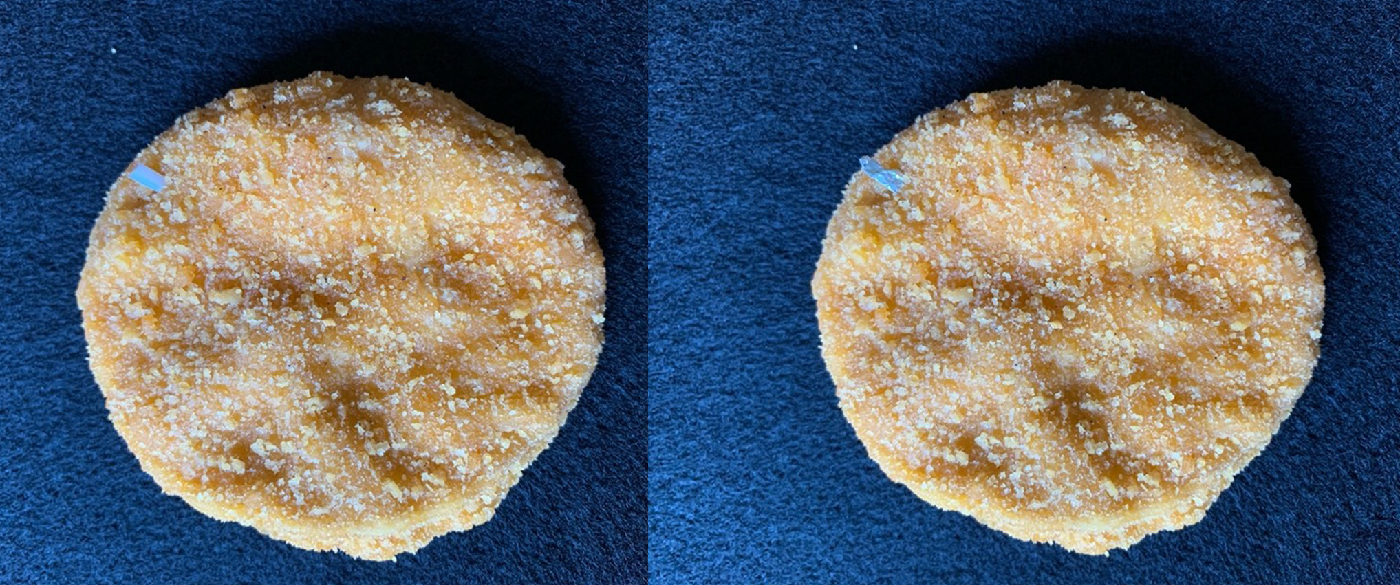 Since the contestants cannot handle the product, they should only evaluate the portions that are fully visible. Be careful not to create multiple defects when one defect causes the other factors by the nature of the main defect. For example, if a patty is broken in half and only one half is displayed, you should record “Broken/Incomplete” as the defect even though it is a different shape or may be missing some breading where the break occurred. You do not record the “Coating Defect” or “Shape/Size Defect” since they are a result of the broken patty.