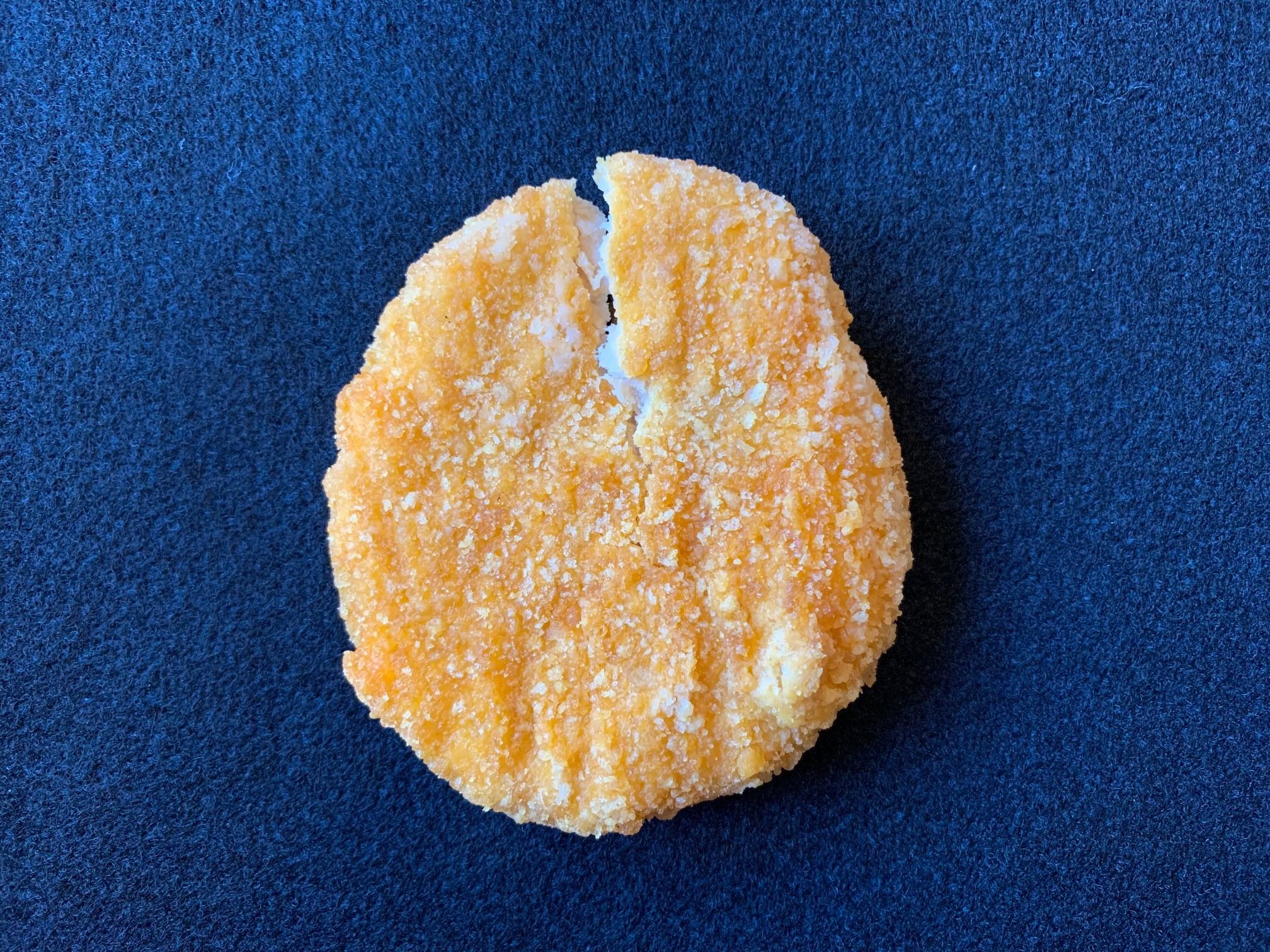 Broken or incomplete products are visible in two ways. An incomplete break is when a product has a break or tear in the meat that is clearly visible. A complete break is when the product is broken apart and displayed in two pieces or as part of the piece. If the complete break is evident and the only part is displayed it should still be recorded as “Completeness of product.” Do not record this type of defect as “Inconsistent Shape and Size” or “Coating Defect” when it is evident that it is part of a broken product and the break is what caused the product to take on these other defects.